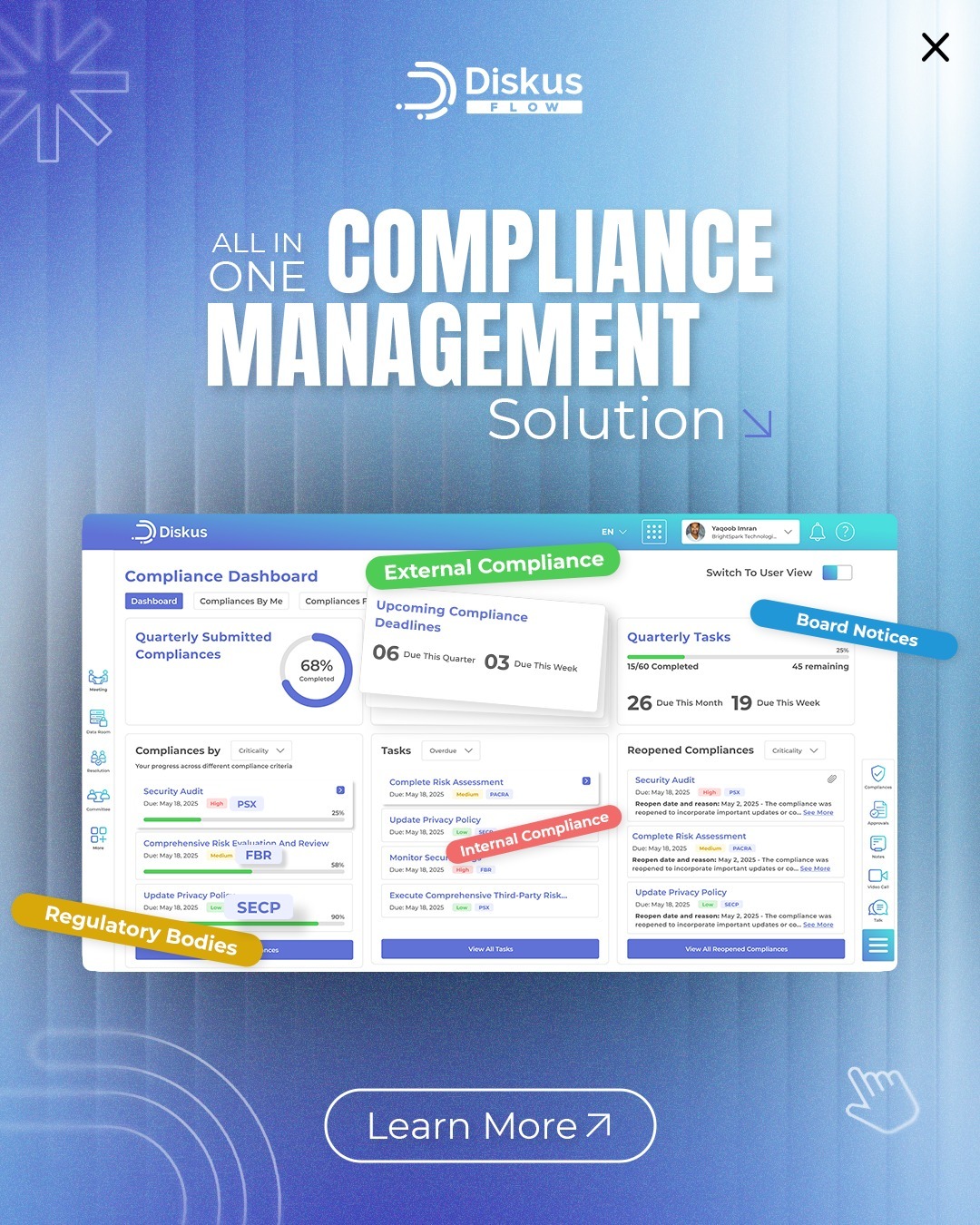 Diskus equips leadership with smart dashboards, real-time tracking, and AI-powered tools to drive faster, informed decisions. Built for modern governance, it blends security, agility, and automation – helping executives lead with clarity in today’s fast-paced, regulated world.
