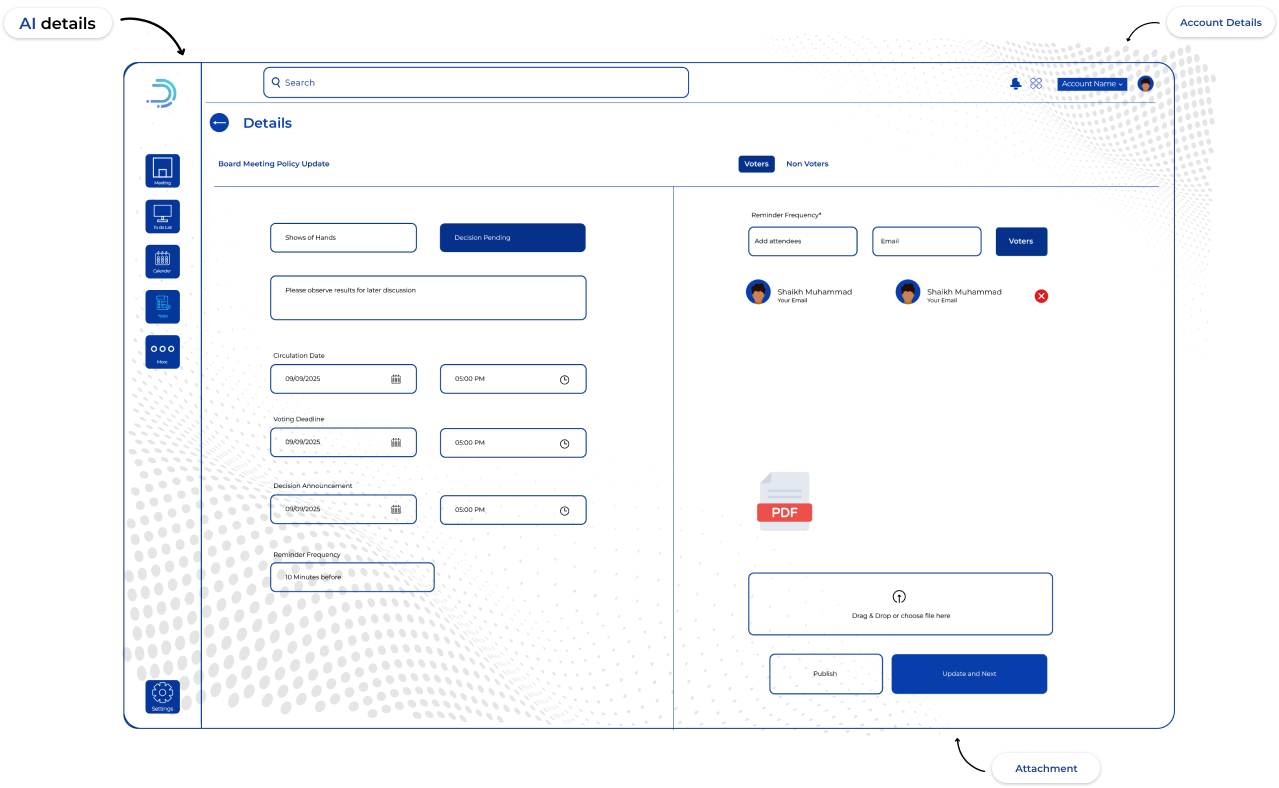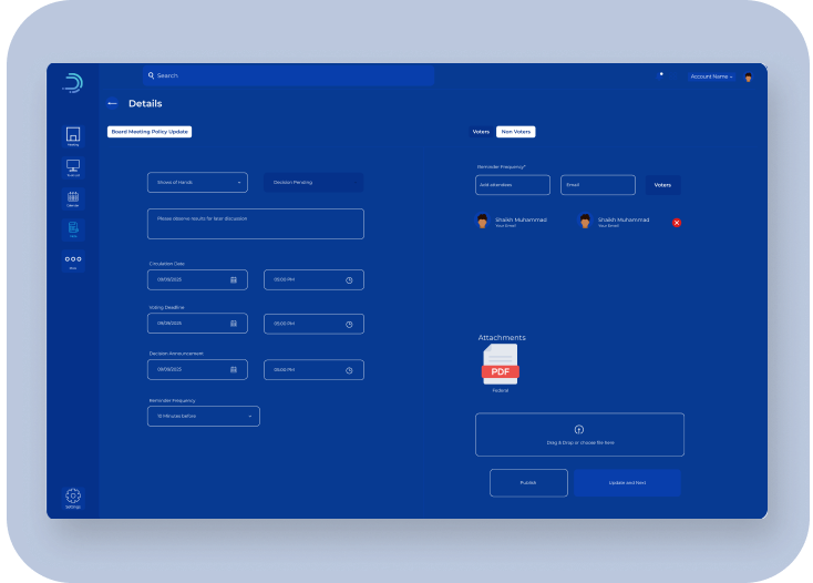 Make decisions faster with real-time polls and digital resolutions. Diskus records and secures all votes instantly, ensuring transparency and a clear audit trail for every action.