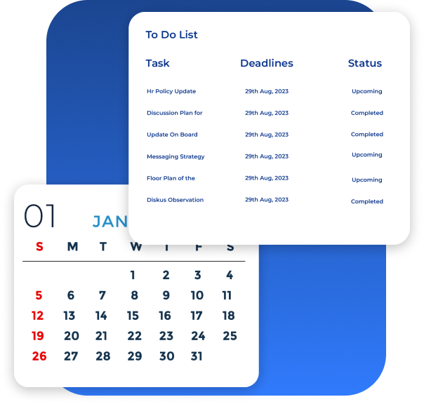 Diskus equips leadership with smart dashboards, real-time tracking, and AI-powered tools to drive faster, informed decisions. Built for modern governance, it blends security, agility, and automation – helping executives lead with clarity in today’s fast-paced, regulated world.